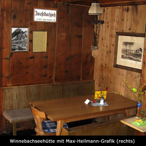 Dieses Foto aus der Homepage Winnebachseehütte (Copyright by Nina Riml 2010) zeigt rechts an der Wand eine Max-Heilmann-Grafik. Zu sehen ist Frankfurt (Oder) mit der Franziskanerkirche (heute: Konzerthalle), die Oder und eine Oderbrücke.